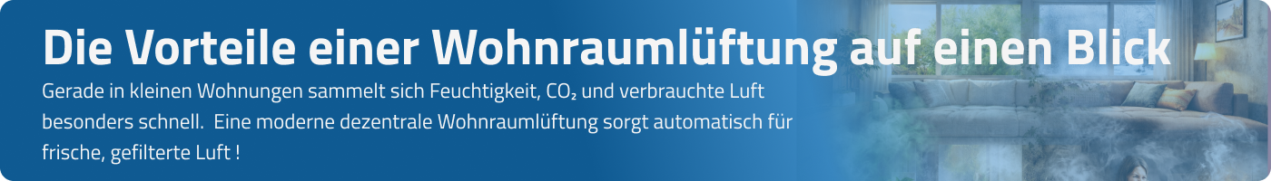 Kleine Wohnungen stellen an die Lüftungstechnik besondere Anforderungen: Der verfügbare Platz ist begrenzt, die Bewohner – ob Seniorinnen und Senioren oder Studierende – wünschen sich unkomplizierte, leise und wartungsarme Lösungen. Gleichzeitig ist das Lüftungsproblem in kleinen Wohnungen oft besonders ausgeprägt: Auf engem Raum erzeugen Bewohner durch Atmen, Kochen und Duschen eine hohe Feuchte- und CO₂-Last, die ohne kontrollierte Lüftung schnell zu Schimmel, schlechter Luftqualität und Unbehagen führt.