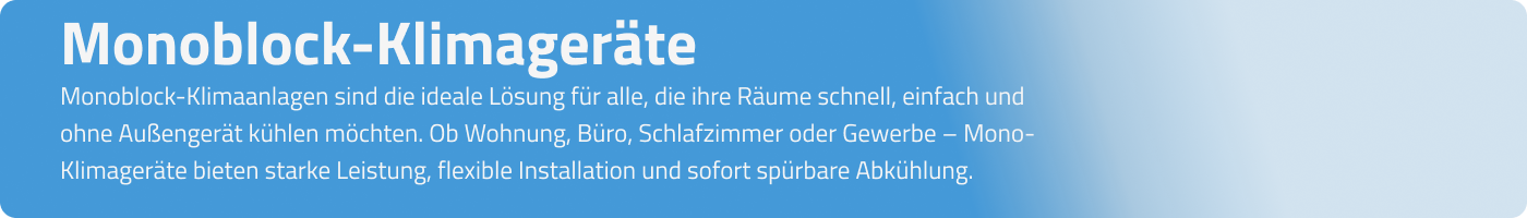 Monoblock-Klimageräte sind kompakte Klimaanlagen, die komplett ohne Außeneinheit auskommen. Alle Komponenten befinden sich in einem Gerät, das im Innenraum installiert wird. Dadurch sind Mono-Geräte besonders beliebt bei Mietwohnungen, Altbauten oder Gebäuden, in denen keine Aussengeräte montiert werden dürfen.